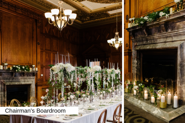 Chairman’s Boardroom is a very versatile space with its original oak wood paneling, so this is a great time for couples to take in the historical elements of the space which perfectly complement a rehearsal dinner or intimate wedding.