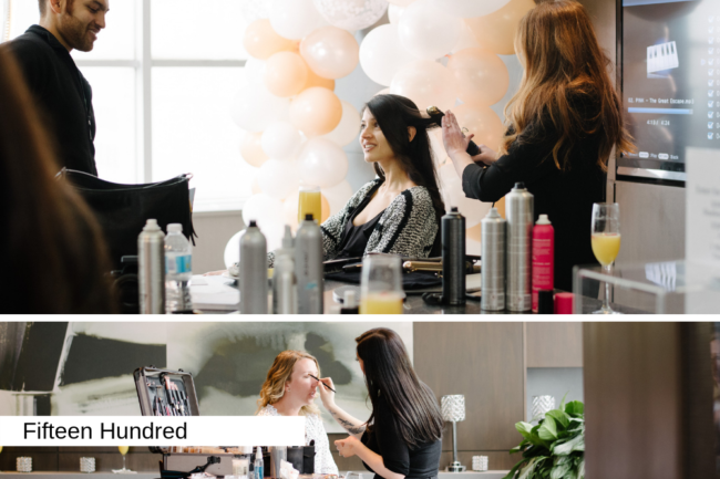 Lastly, Fifteen Hundred, our most modern venue is taken over as a get-ready room for the Wedding Open House. This space is most commonly used by brides as a place for them to spend the night before their big day, as well as to get ready and take some incredible photos throughout the venue. That’s why we welcome hair and makeup vendors so couples can envision themselves starting their special celebration in this luxurious space.