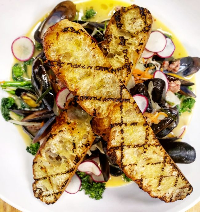 - 8. In a bowl, place the rappini at the bottom, then carefully place the mussels on top. Pour the sauce over the mussels and present with grilled bread to be dipped in the sauce.