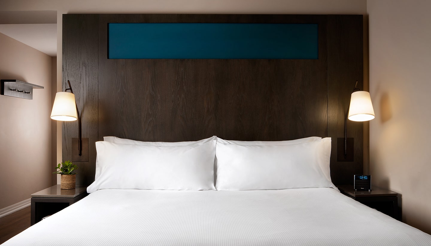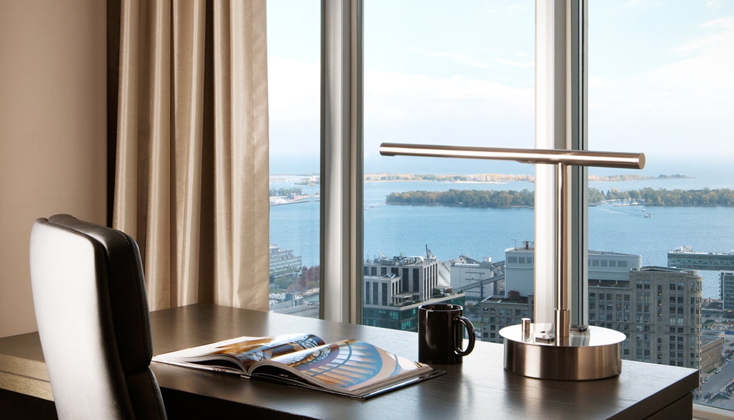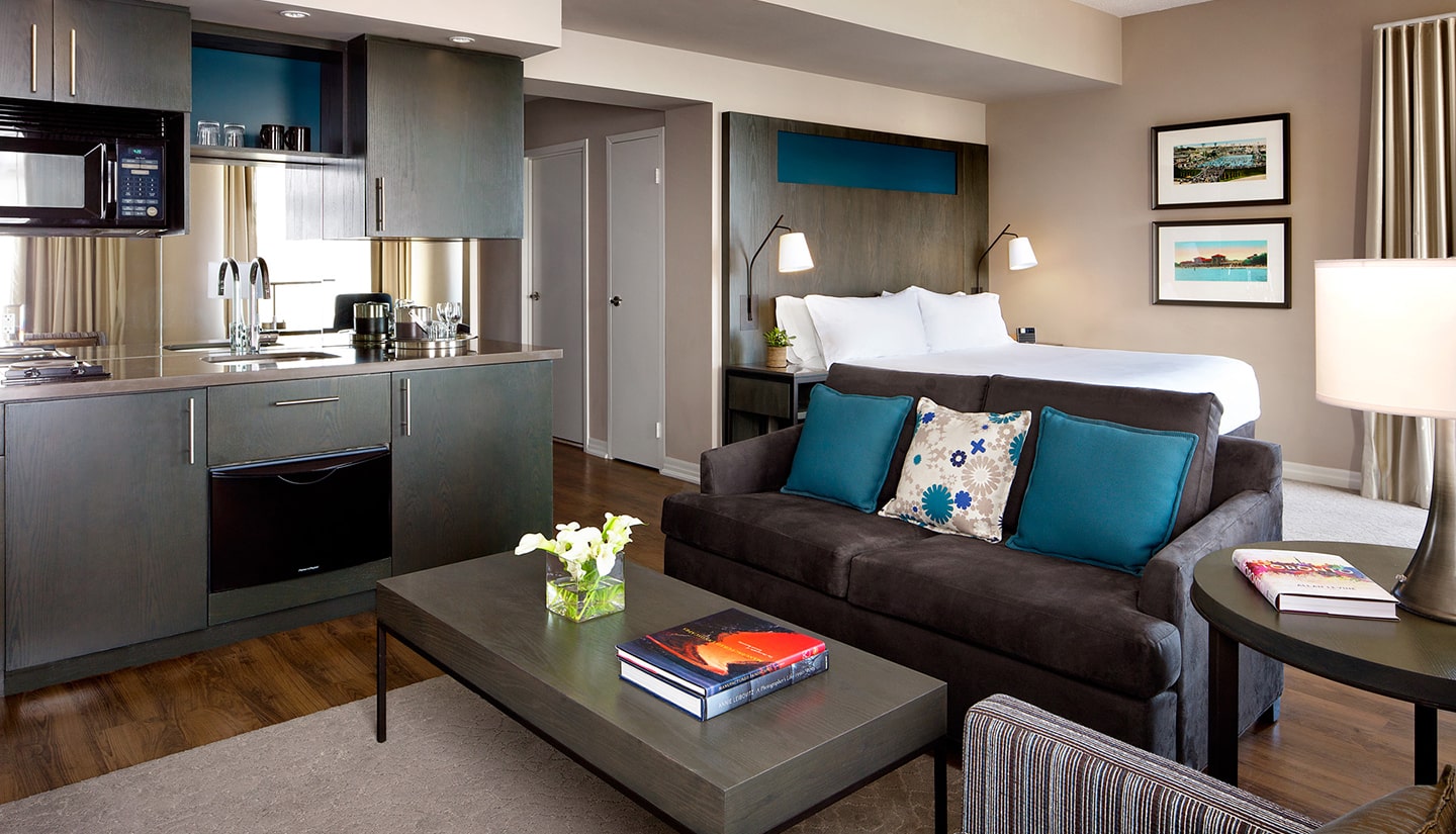 Our popular Tower Premium suites span the entire width of the building and provide spectacular panoramic views of the city or lake. Each suite features a luxurious king-sized bed, separate lounge area with stylish furniture and large-screen HDTV, a kitchenette with mini-fridge, microwave oven and dishwasher, and en suite washer & dryer.