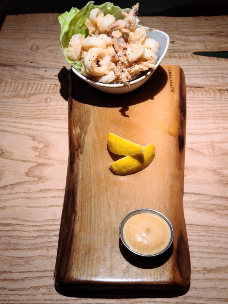 3. In a bowl take all-purpose flour and add the marinated calamari by draining the liquid. Dredge well and deep fry for 20 – 30 seconds. Drain the oil and put it in a bowl and season with lemon pepper, cracked black pepper, and salt to taste.