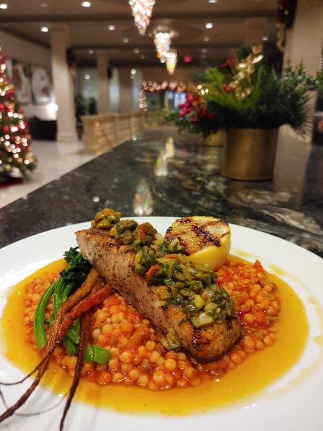 Grilled Salmon, Fregola, Rapini, and Roasted Carrots with a Cucumber, Caper & Cured Tomato Condiment