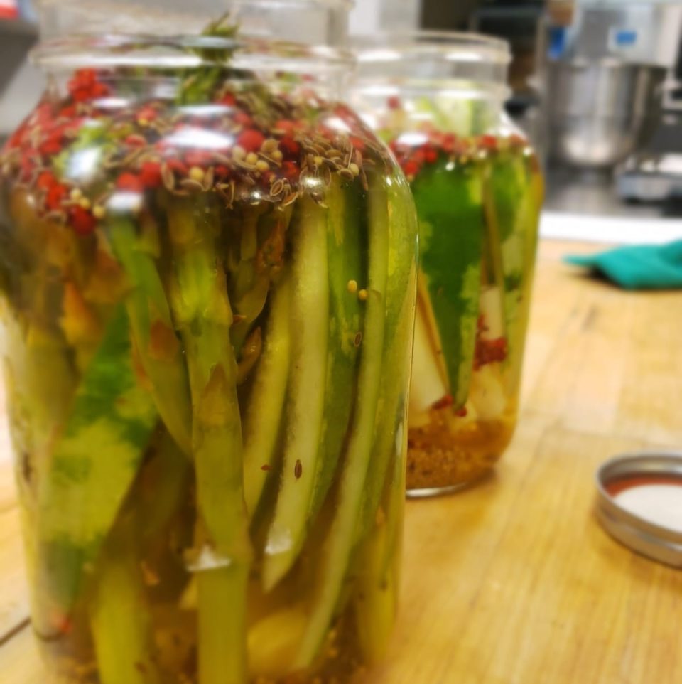 - 3. Clean, wash and dry asparagus and watermelon rinds and put in a mason jar.
