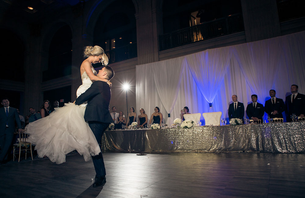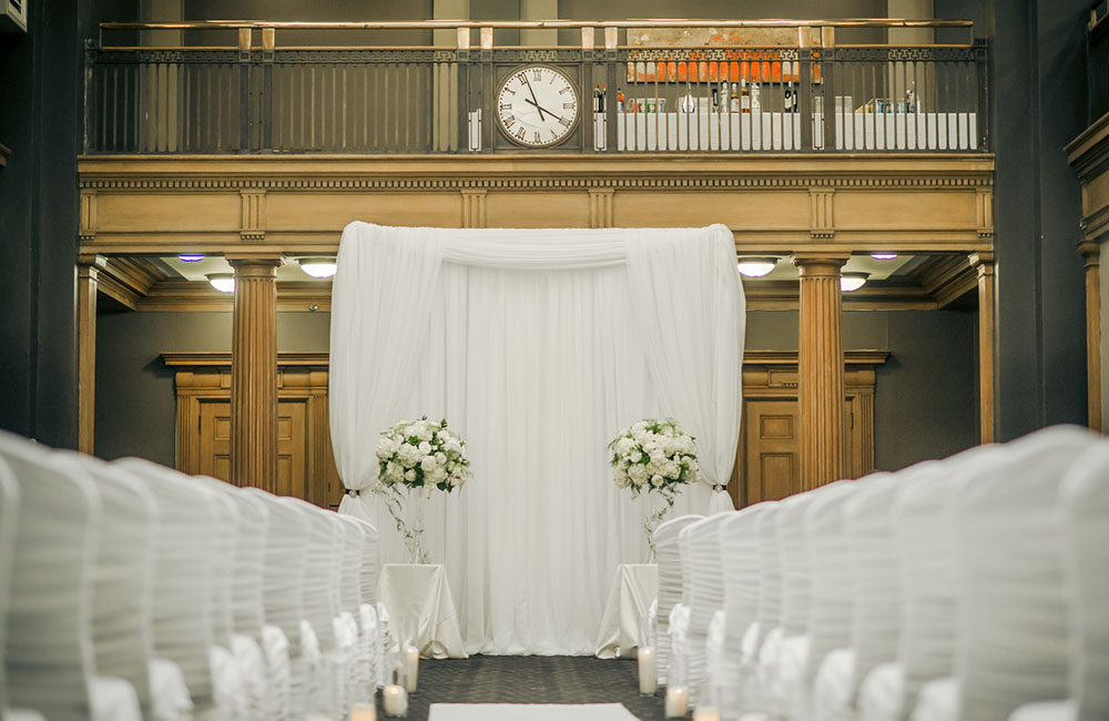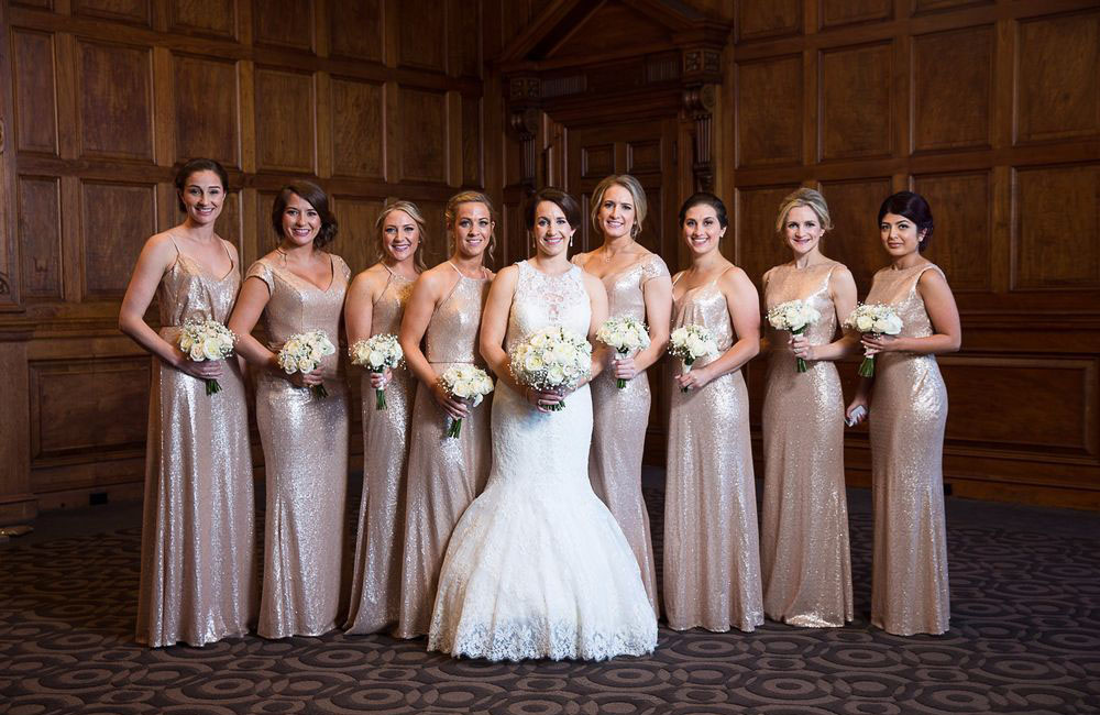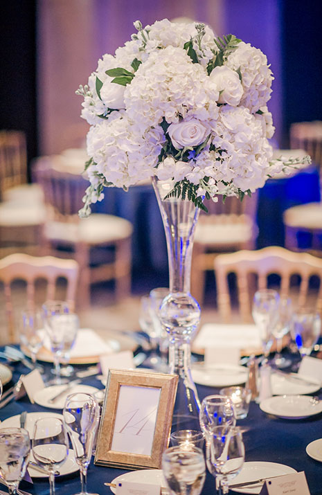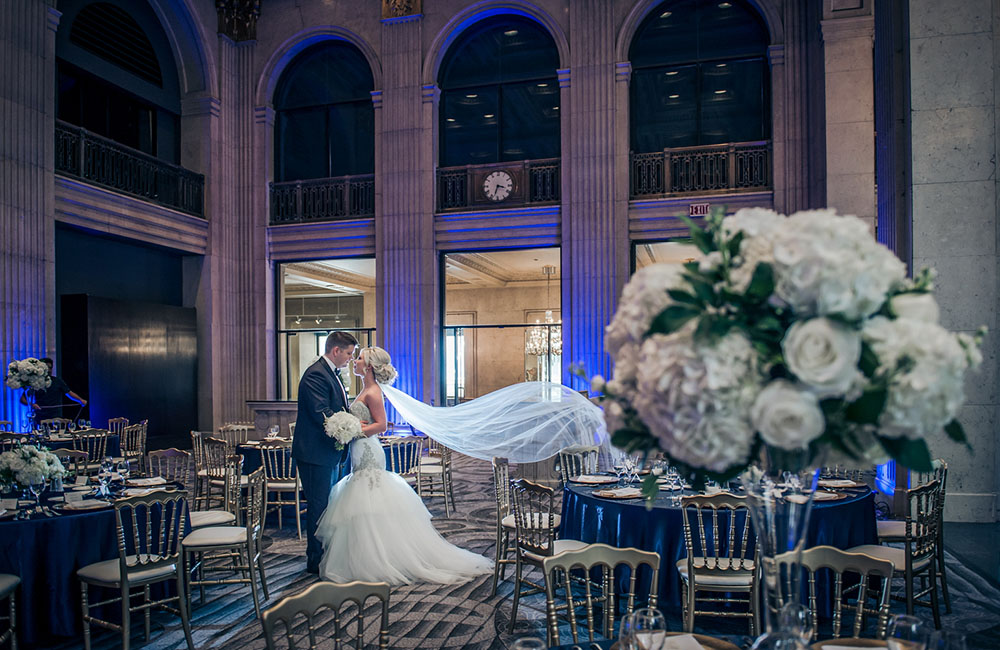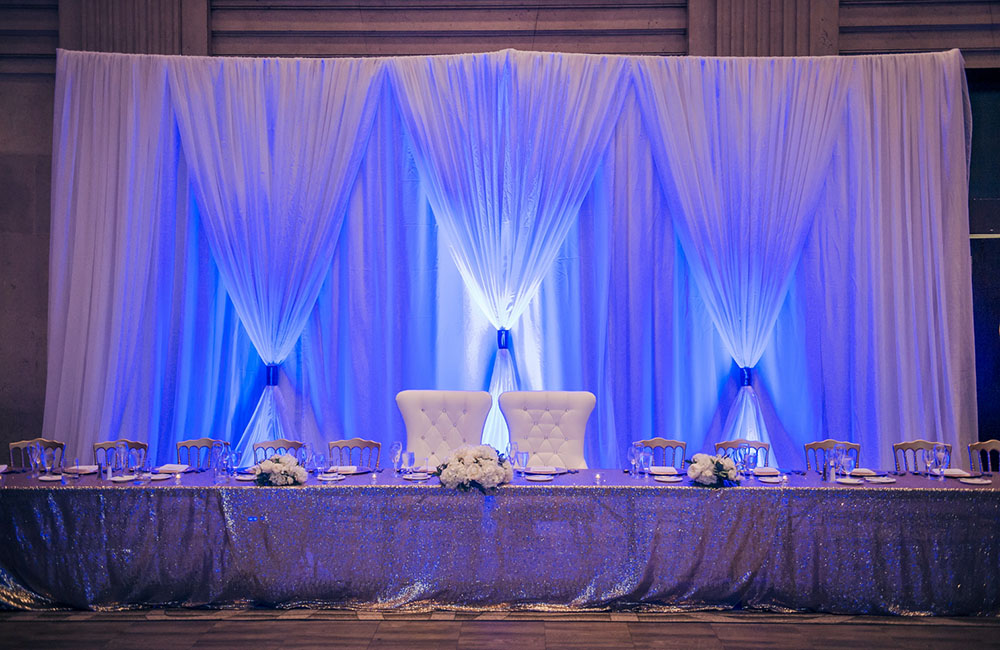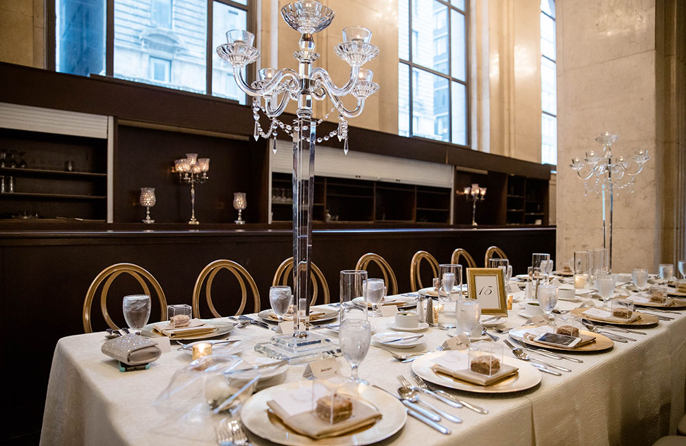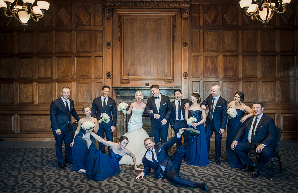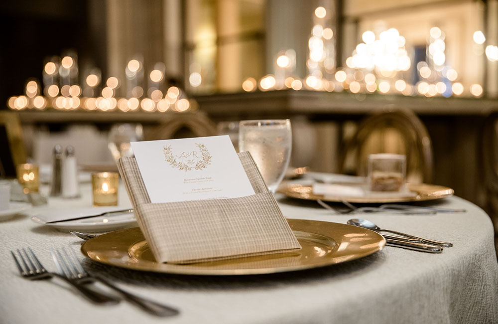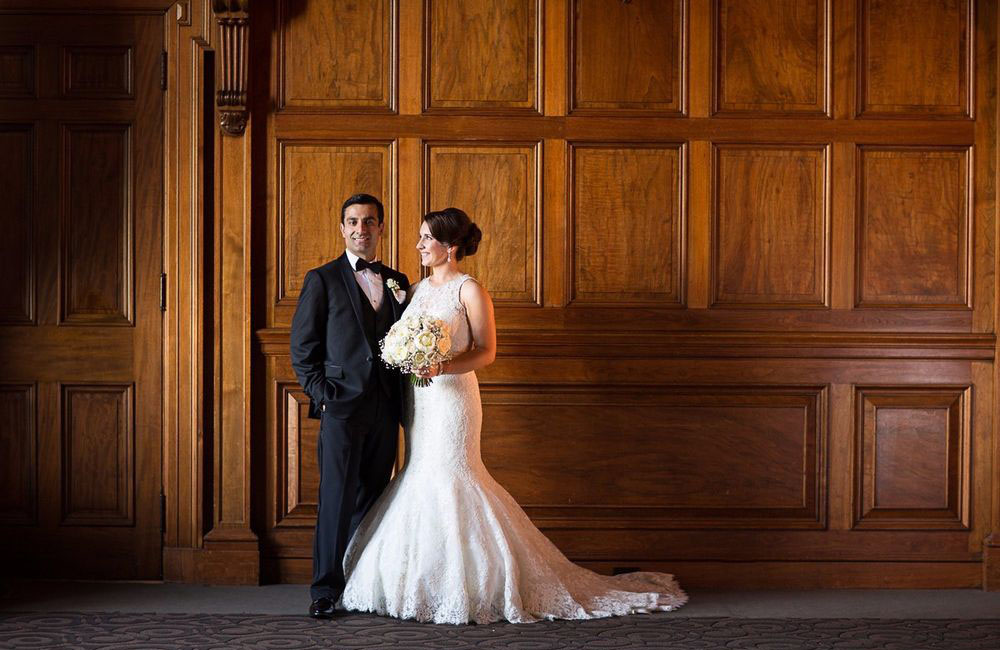 Pinch-pleat, brocade window treatments topped with decorative oak pelmets frame generous seven-foot windows for an abundance of light. The focal point of the room, besides the bride and groom, is the century old blue-green marble fireplace imported from Nassau, Germany. This room is one of our most popular reception halls for weddings.