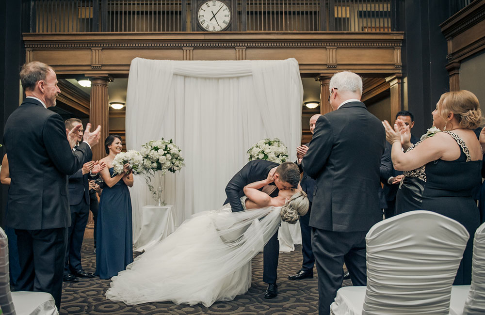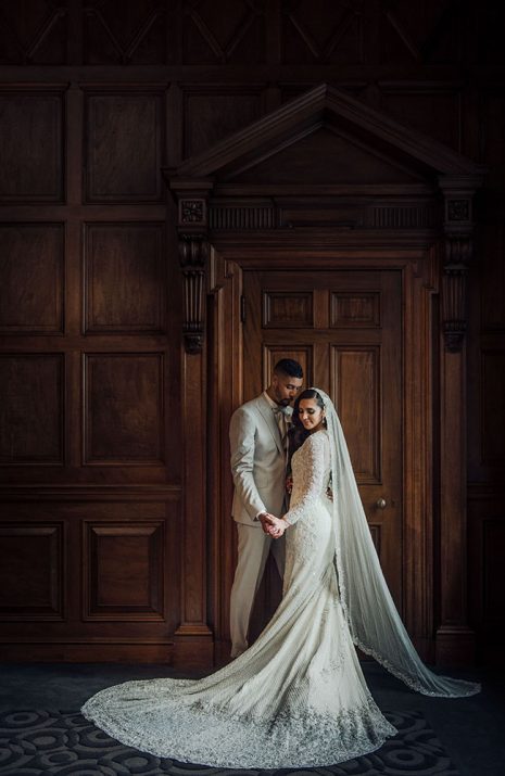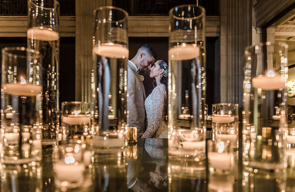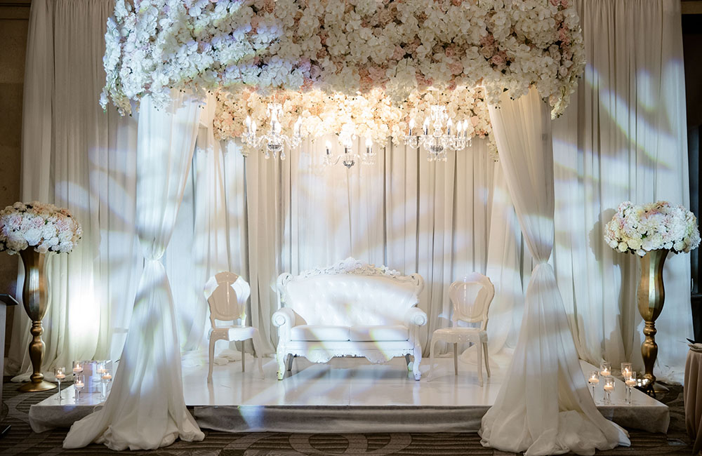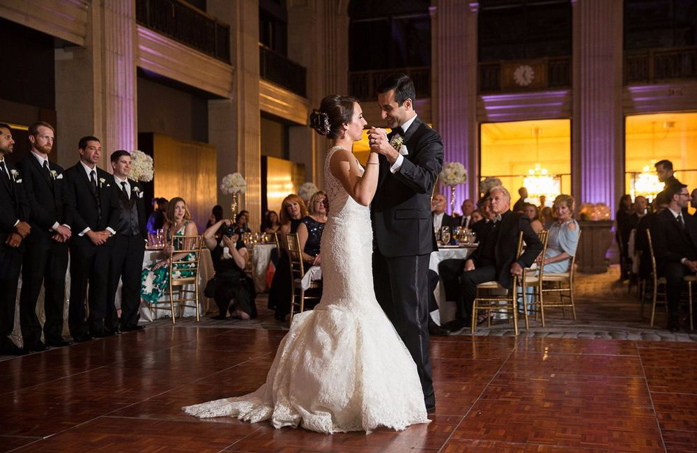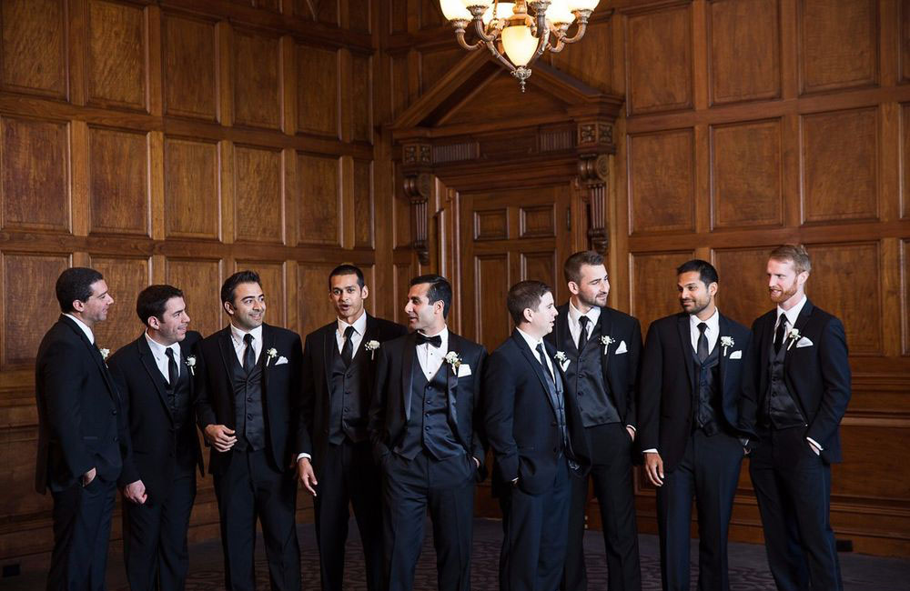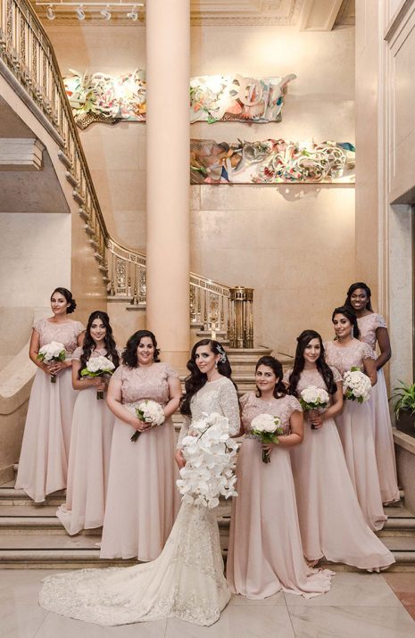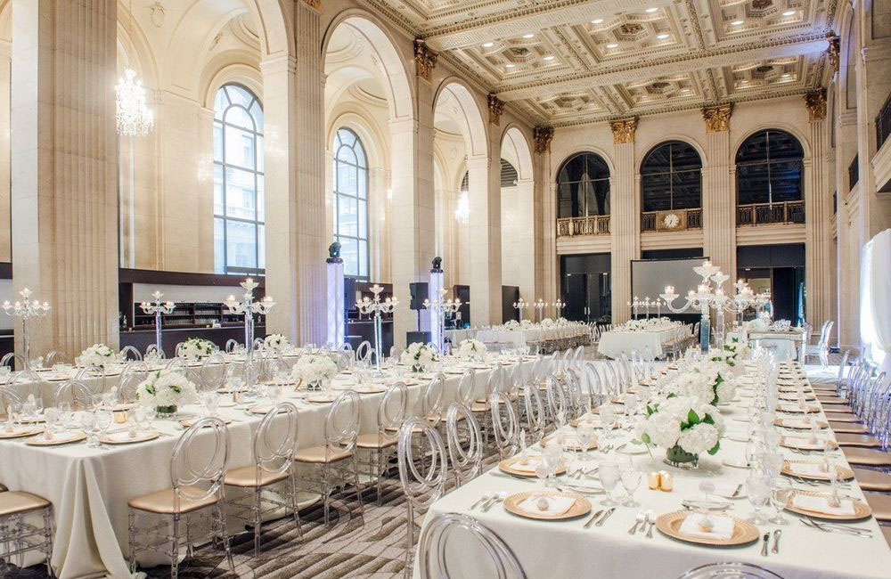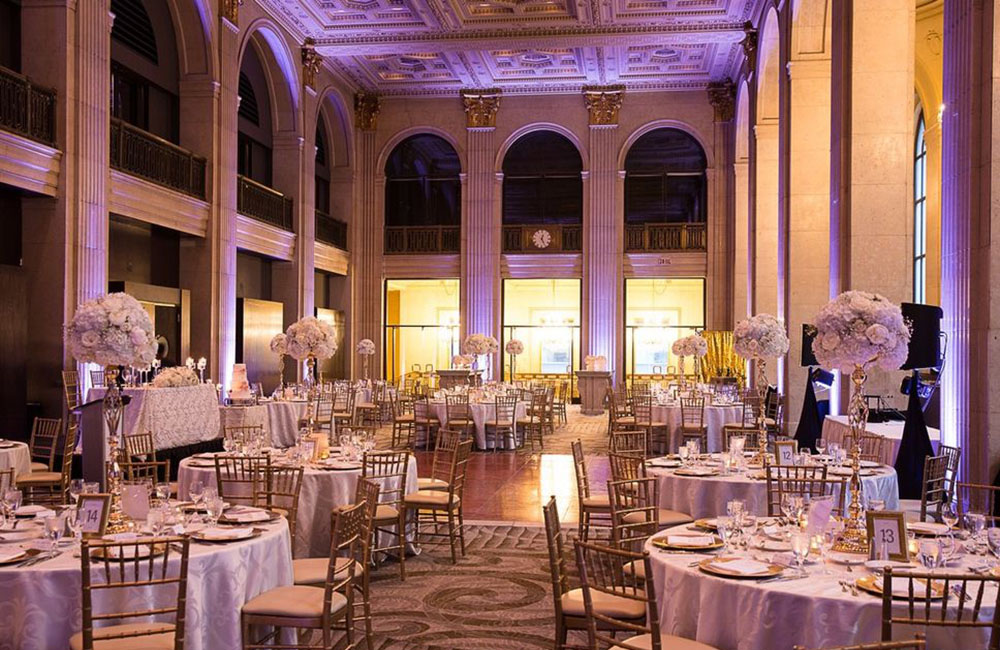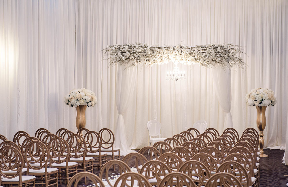 Pinch-pleat, brocade window treatments topped with decorative oak pelmets frame generous seven-foot windows for an abundance of light. The focal point of the room, besides the bride and groom, is the century old blue-green marble fireplace imported from Nassau, Germany. This room is one of our most popular reception halls for weddings.