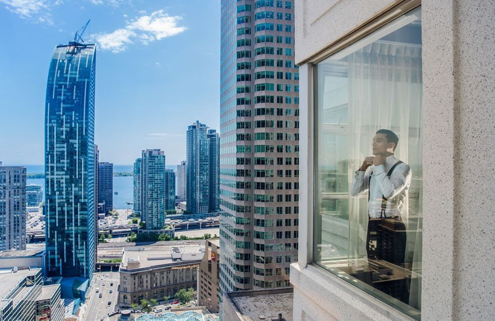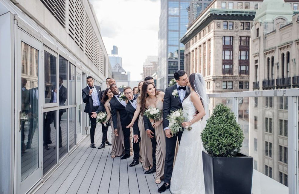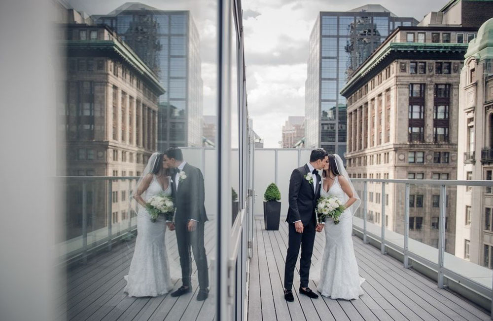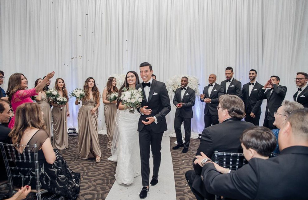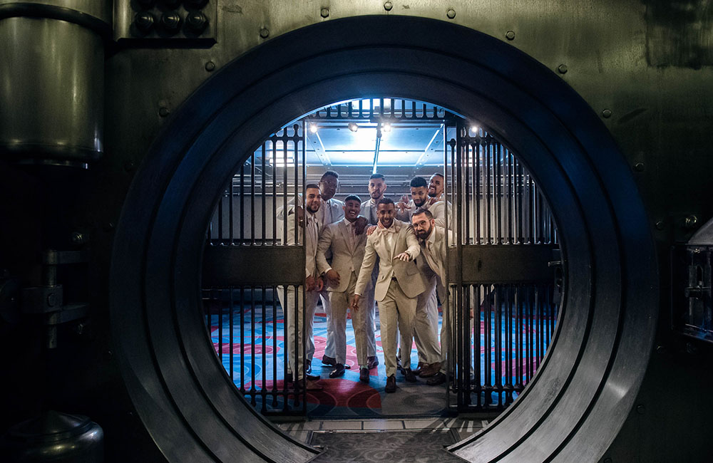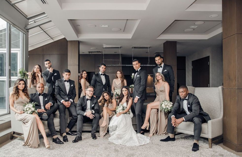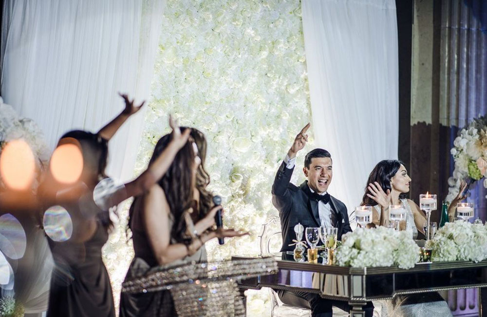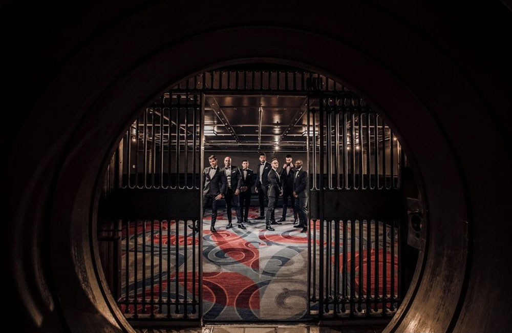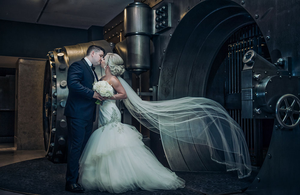 Pinch-pleat, brocade window treatments topped with decorative oak pelmets frame generous seven-foot windows for an abundance of light. The focal point of the room, besides the bride and groom, is the century old blue-green marble fireplace imported from Nassau, Germany. This room is one of our most popular reception halls for weddings.